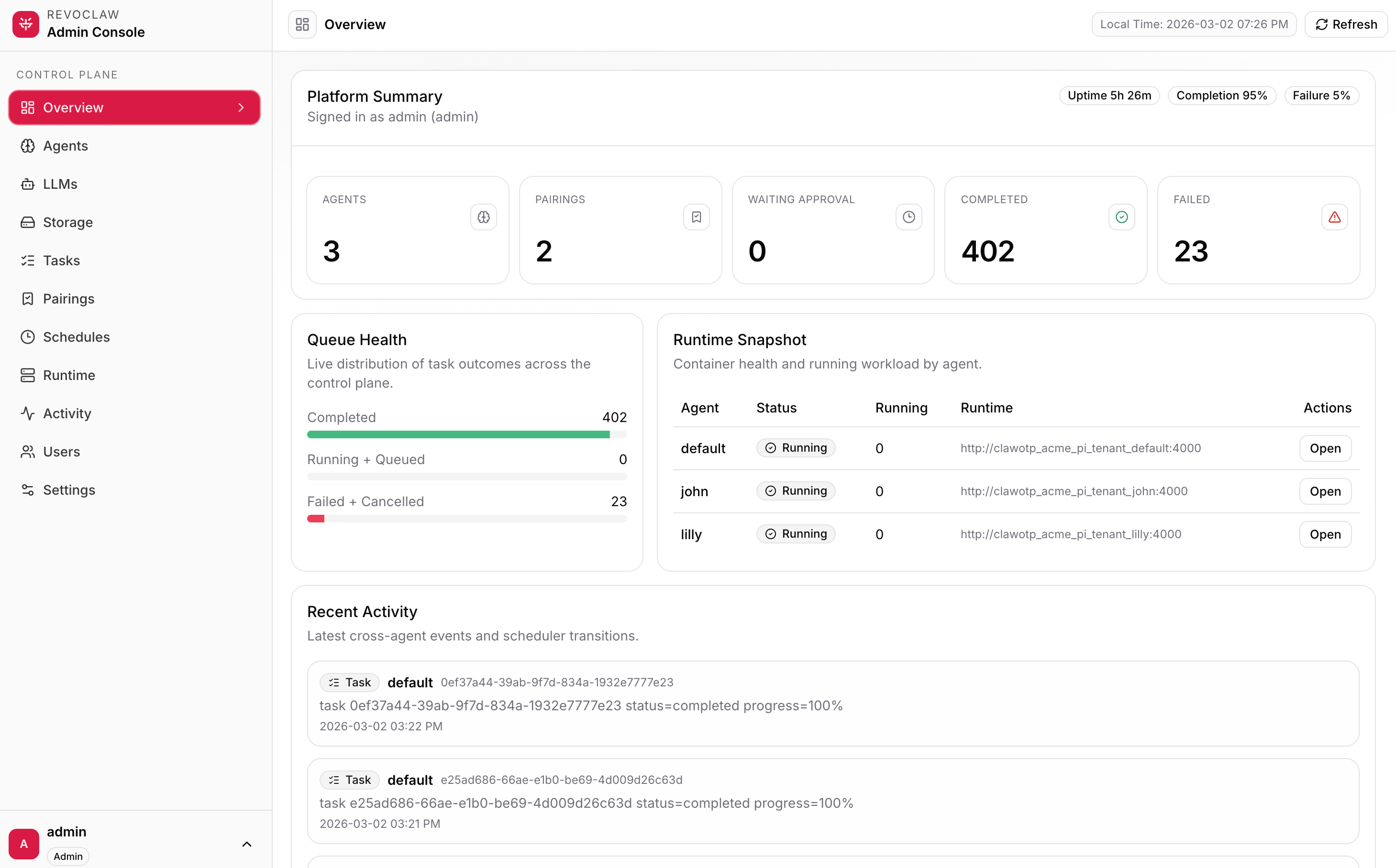Surgical control over your cloud-native agents. Monitor runtimes, queue health, and task orchestration in real-time.